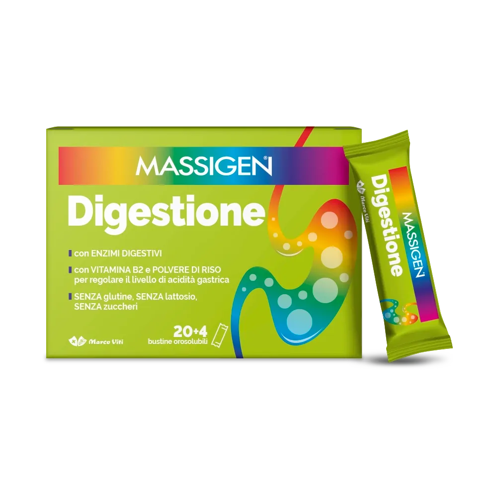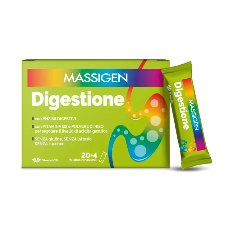 Con Enzimi Digestivi, Vitamina B2 e polvere di riso per regolare il livello di acidità gastrica.